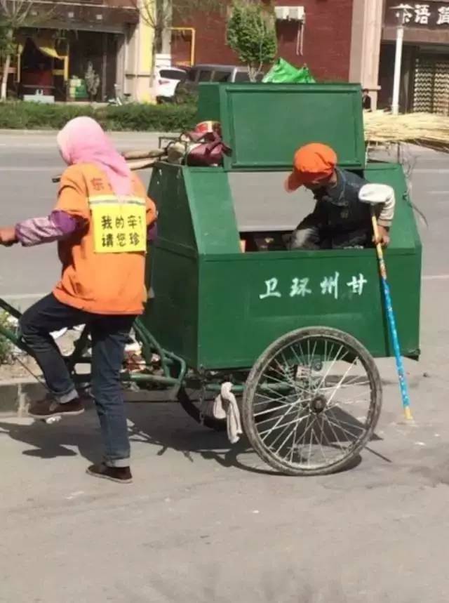 带着自己的小孙儿认真地清扫街道。